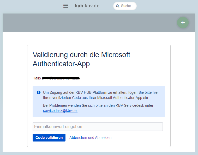 Nach Eingabe des Einmalkennwortes und bestätigen durch "Code validieren" gelangen Sie auf den gewünschten HUB Bereich.
