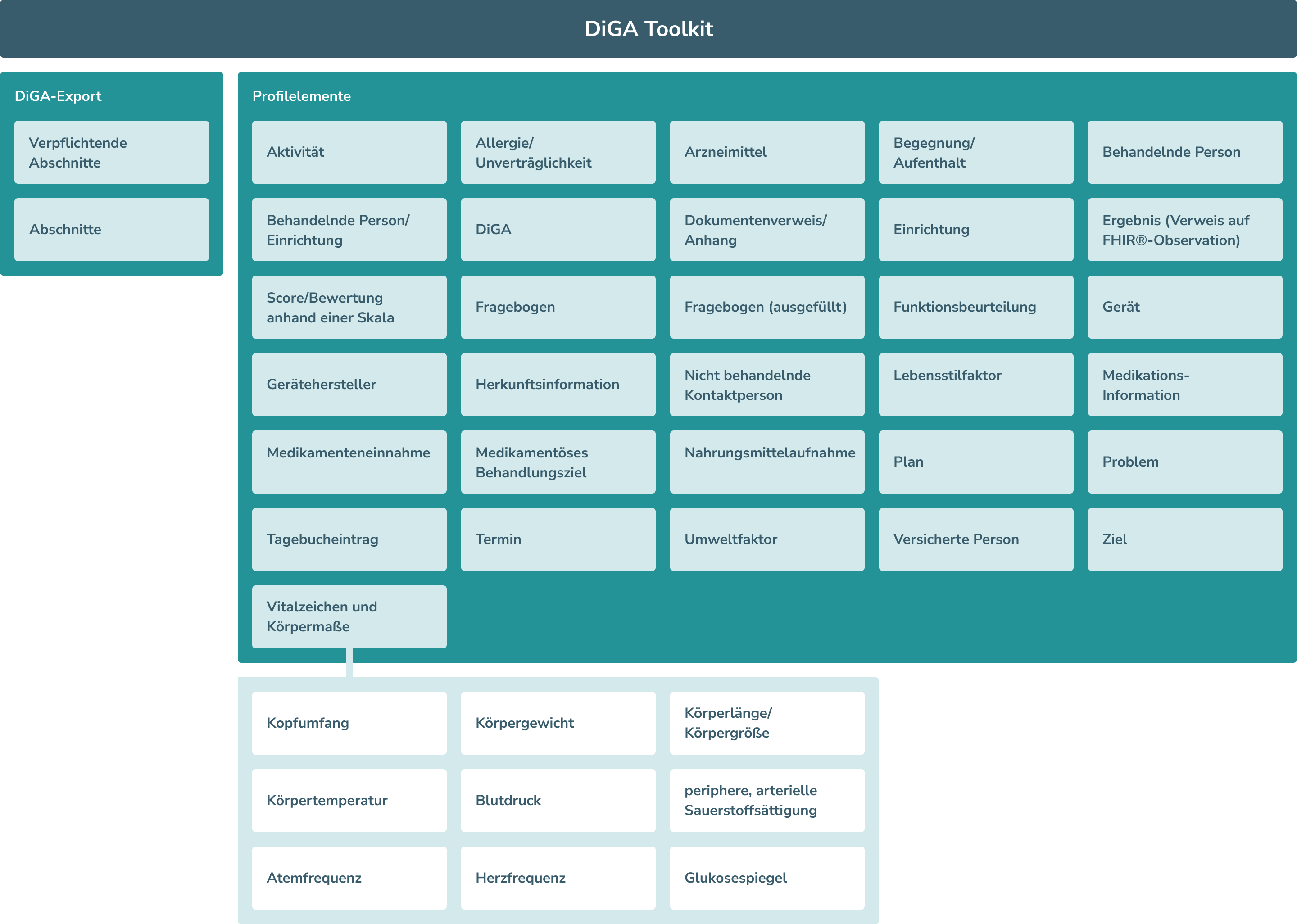 Die folgende Abbildung zeigt ausschließlich die beiden Abschnitte "DiGA-Export" und "Profilelemente" und enthält keine Kardinalitäten, sprich keine Angaben, ob und wie häufig ein bestimmtes Element vorliegen kann bzw. muss. Diese Angaben sind abhängig vom Szenario und können folgendem Bereich entnommen werden: Anwendungsszenarien, Phase II. Für die Lesbarkeit die Zoom-Stufe erhöhen.