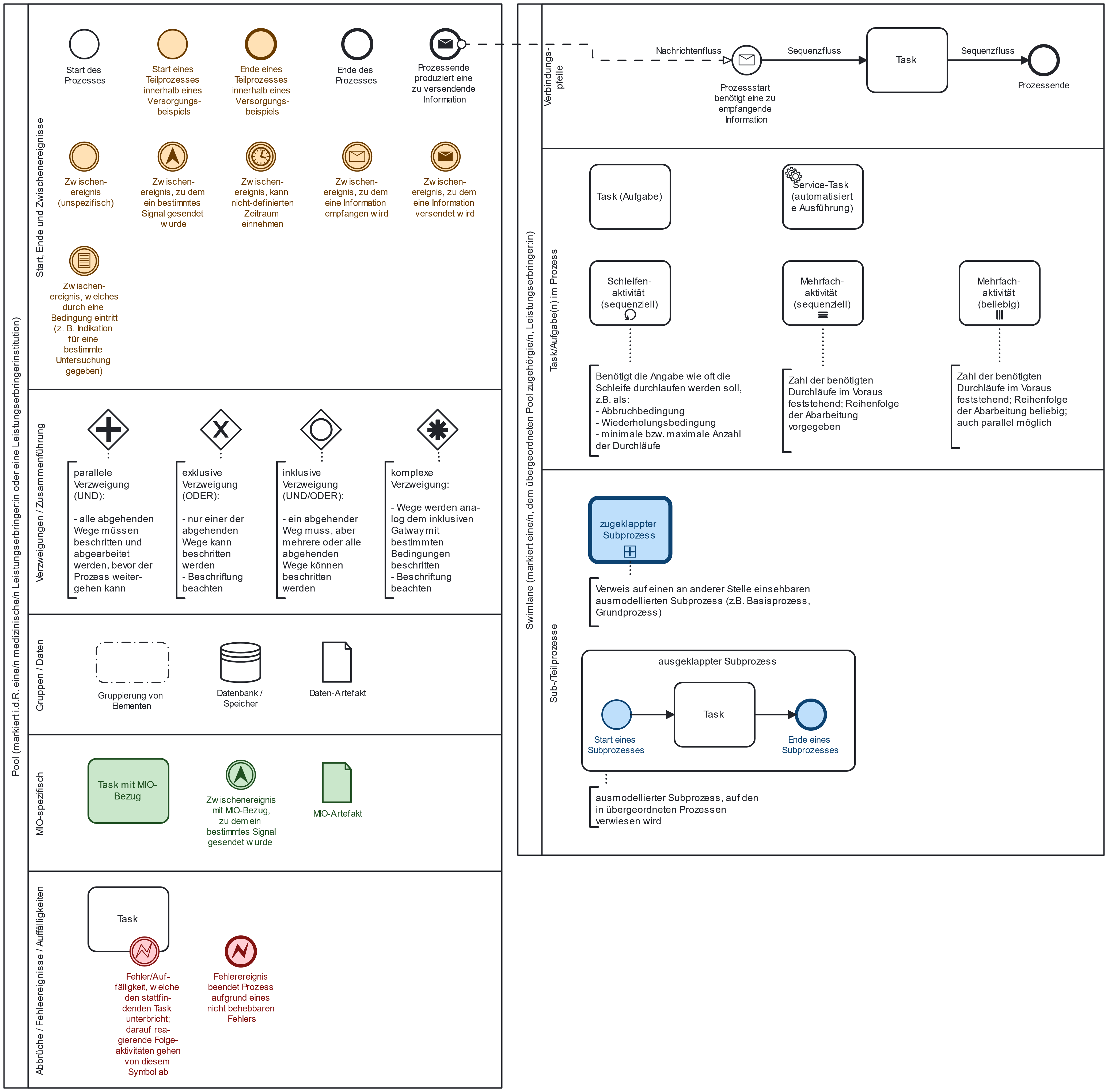 Für die Modellierung der Versorgungsprozesse wurden die anliegenden Symbole verwendet. Die Erarbeitung und Abbildung erfolgte mit der Software Camunda (Version 1.6).