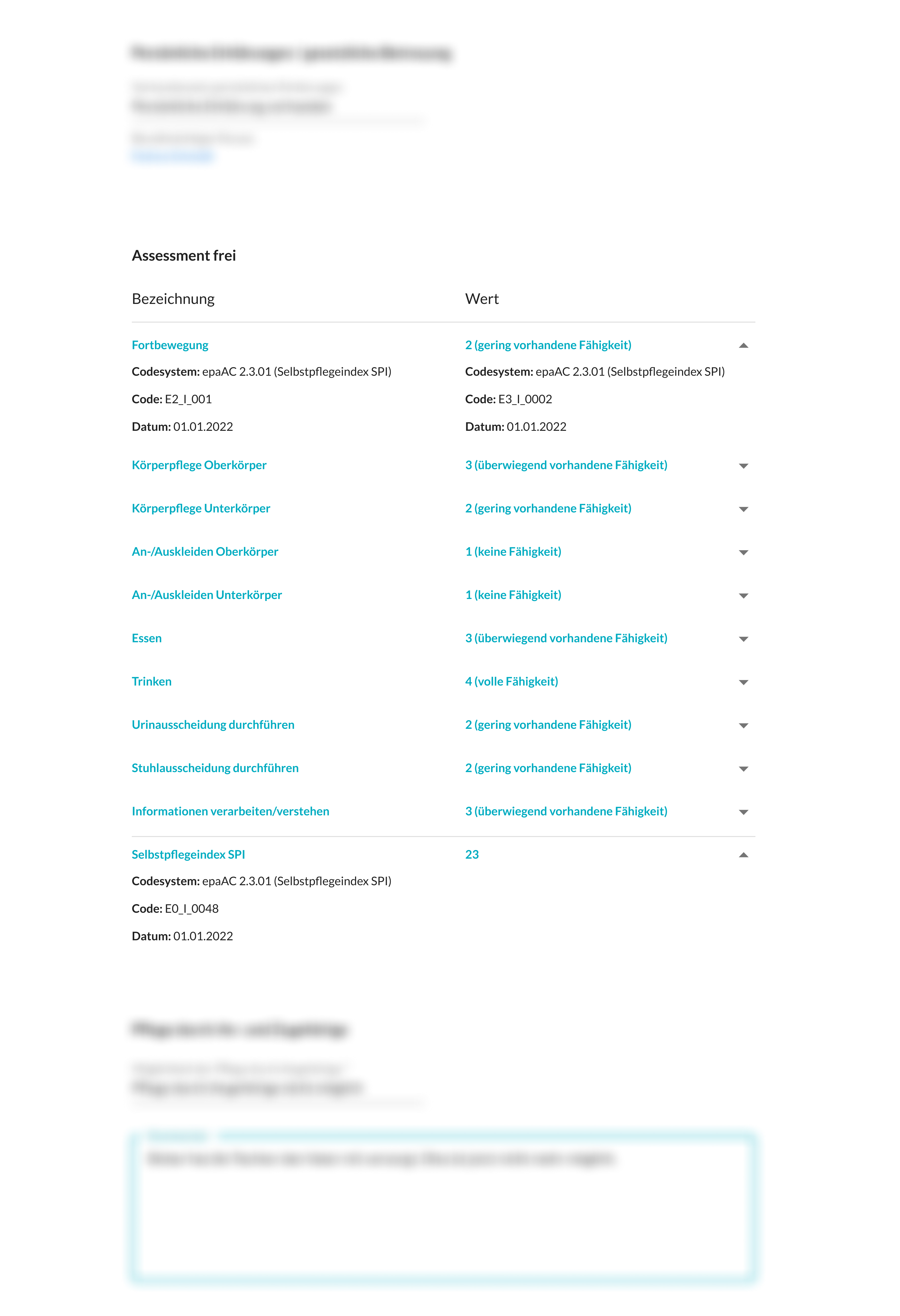 Im Folgenden ist dargestellt, wie das freie Assessment verwendet werden kann, um den Selbstpflegeindex (SPI) des Pflegeklassifikationssystems epaCC abzubilden. Diese Darstellung ist eine Hilfe, um sich das Modell in Aktion vorzustellen. Das eher technische und genauere Mapping der Informationen auf unser Informationsmodell sehen Sie unten auf der Seite Fallbeispiel 2 - Überleitungsbogen von Frau Elfriede Schlosser.