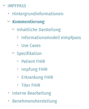Herzlich willkommen im Kommentierungsbereich! Die Kommentierung ist in folgende Bereiche unterteilt: unter inhaltlicher Darstellung finden Sie das dem EImpfass zugrunde liegende Informationsmodell und die dazugehörigen use cases. Im Bereich Spezifikation sehen Sie ... und können direkt den gewünschten Abschnitt/Bereich kommentieren.