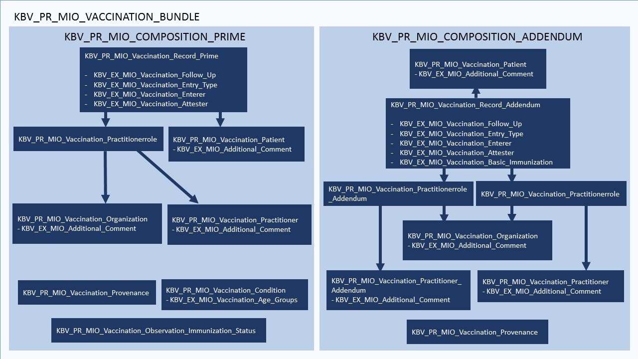 Die Compositions KBV_PR_MIO_Vaccination_Composition_Prime und KBV_PR_MIO_Vaccination_Composition_Addendum geben die Struktur des Dokumentes vor. Die Inhalte bestehen aus Verweisen auf andere Ressourcen. Da ein Dokument im juristischen Sinne vollständig und unveränderlich sein muss, wird die Composition mit allen referenzierten Ressourcen zu einem Bundle zusammengefasst (KBV_PR_MIO_Vaccination_Bundle_Entry).