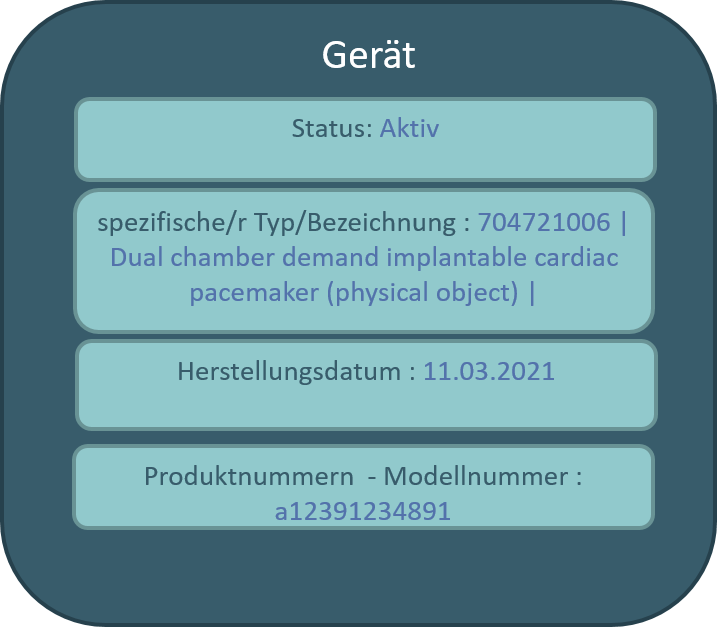 In diesem Element können Informationen zu einem Gerät bzw. Medizinprodukt angegeben werden. Hierbei handelt es sich um ein generisches Profil welches zur Abbildung von unterschiedlichen Gerätearten genutzt werden kann.
