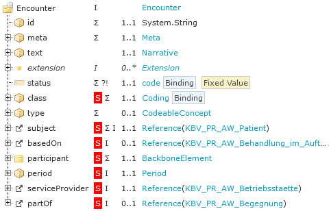 Begegnung Die im FHIR®-Profil abgebildete Information findet sich im Informationsmodell unter 5. Begegnung, 5.1 Referenz Patient, 5.2 Referenz Behandlung im Auftrag, 5.3 Behandelnder, 5.3.1 Referenz BehandelnderFunktion, 5.3.2 ANR, 5.4 Datum, 5.4.1 von, 5.4.2 bis, 5.5 Referenz Betriebsstätte, 5.6 Referenz Begegnung, 5.6.1 Begegnung, 5.7 Spezielle Begegnungsinformationen, 5.7.1 Typ und 5.7.2 Inhalt.