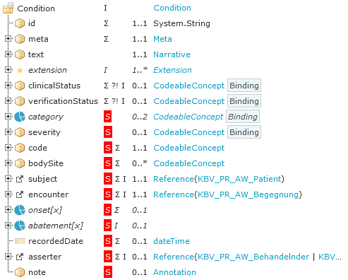 Diagnose Die im FHIR®-Profil abgebildete Information findet sich im Informationsmodell unter 13. Diagnose, 13.1 Code/Bezeichnung, 13.1.1 Code-Auswahl, 13.1.1.1 ICD-10-GM-Code, 13.1.1.2 ALPHA-ID- Code, 13.1.1.3 SNOMED CT®-Code, 13.1.1.4 ORPHANET-Code, 13.1.2 Freitext Diagnose, 13.10 Feststellungsdatum, 13.11 Ausnahmetatbestand, 13.12 Dokumentationsdatum, 13.13 Referenz Behandelnder / BehandelnderFunktion, 13.14 Freitext Beschreibung, 13.15 Abrechnungsrelevant, 13.2 Klinischer Status, 13.3 Diagnosesicherheit, 13.4 Dauerdiagnose, 13.5 Schweregrad, 13.6 Körperstelle, 13.7 Referenz Patient, 13.8 Referenz Begegnung, 13.9 Klinisch relevanter Zeitraum, 13.9.1 Lebensphase, 13.9.1.1 von, 13.9.1.2 bis, 13.9.2 Zeitraum datiert, 13.9.2.1 von/am, 13.9.2.2 bis und 47.22 Diagnosetext.