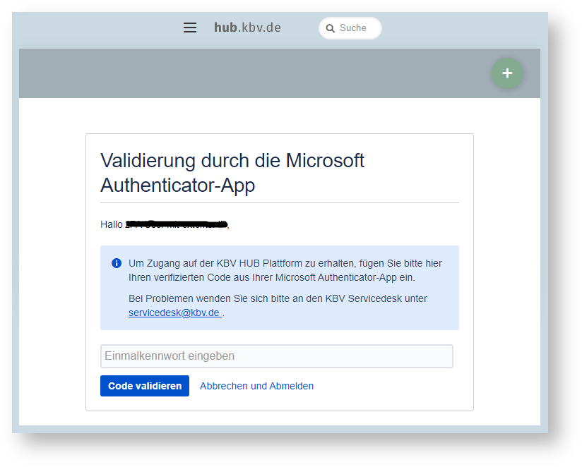 Nach Eingabe des Einmalkennwortes und bestätigen durch "Code validieren" gelangen Sie auf den gewünschten HUB Bereich.