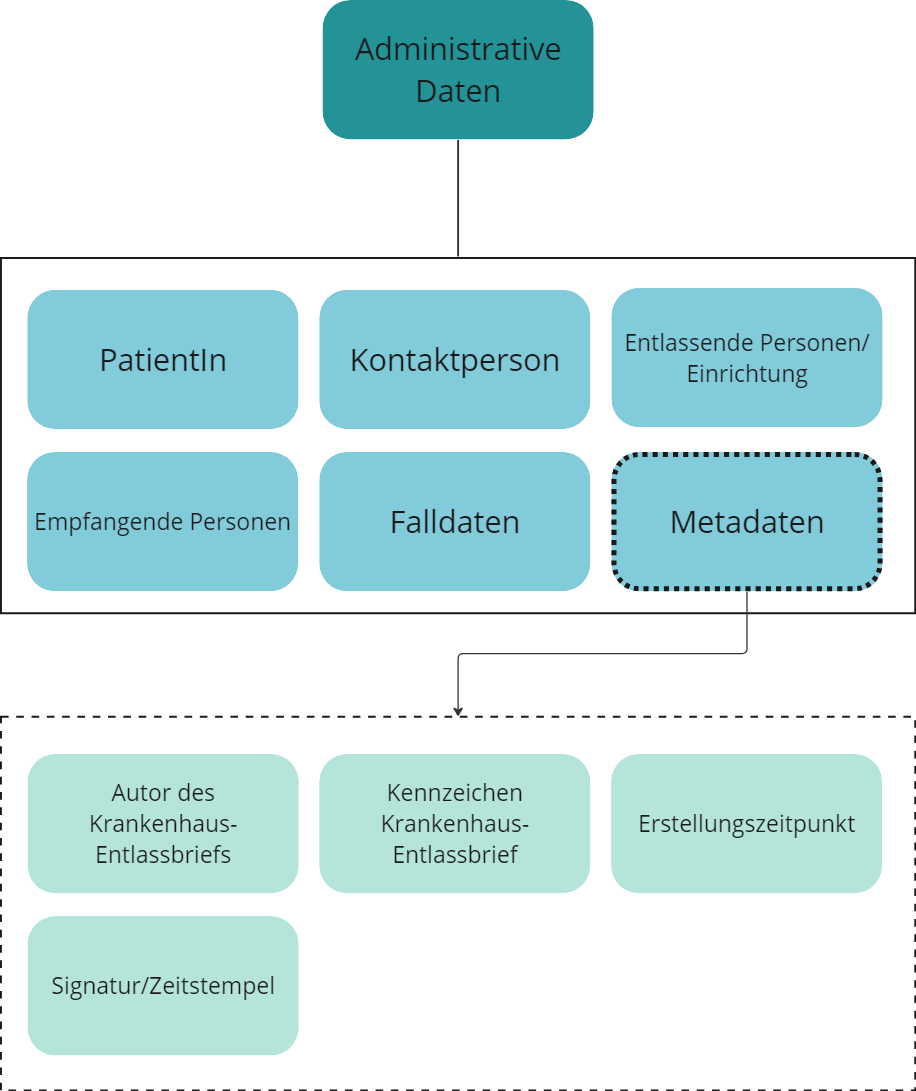 In der folgenden Abbildung 3 werden die Gruppen bzw. Elemente der Gruppe "Administrative Daten" des Informationsmodells aufgeführt. Diese Gruppe bildet u. a. Informationen zum/zur Patient:in, der entlassenden Person/Einrichtung, etc. ab.