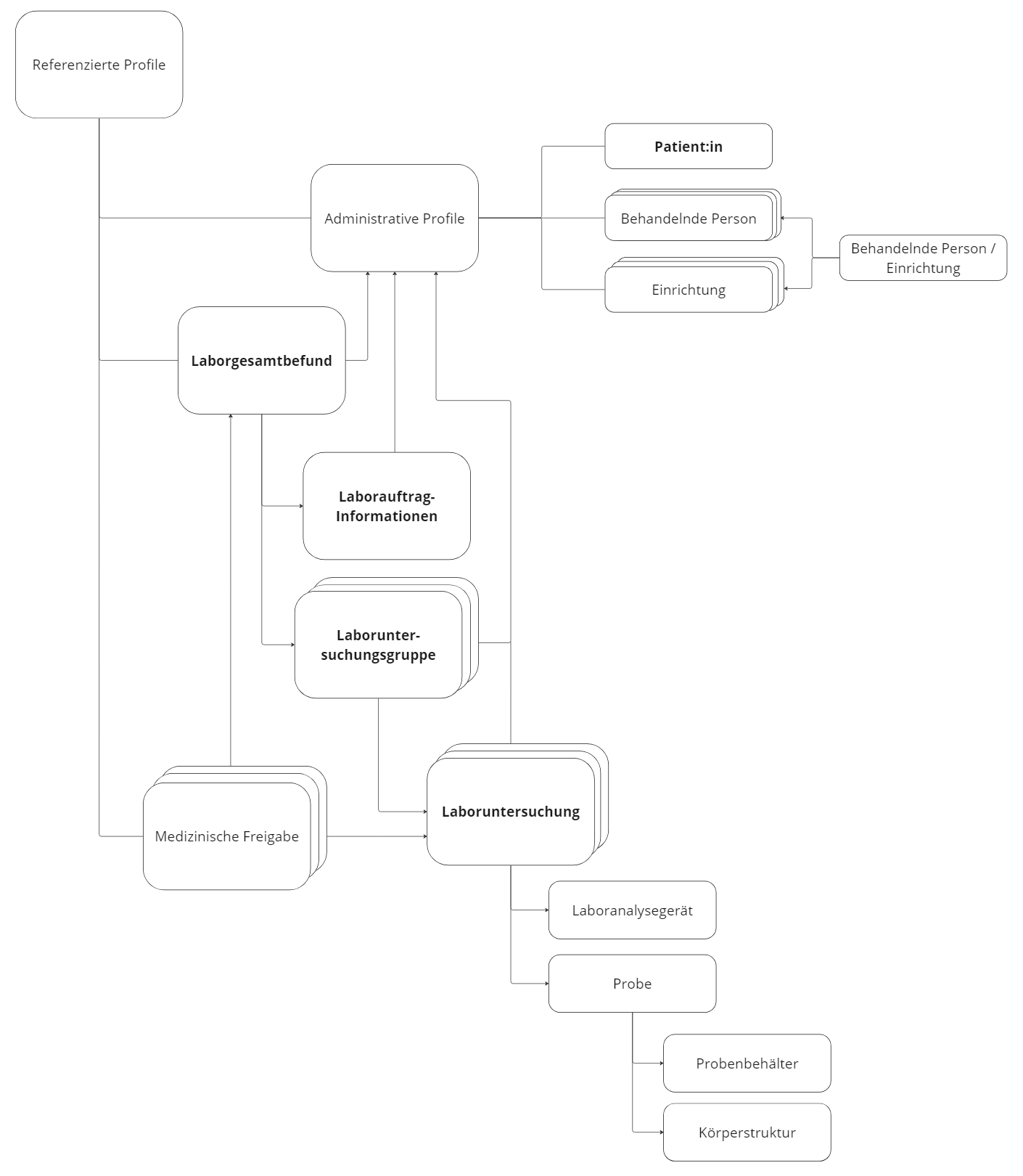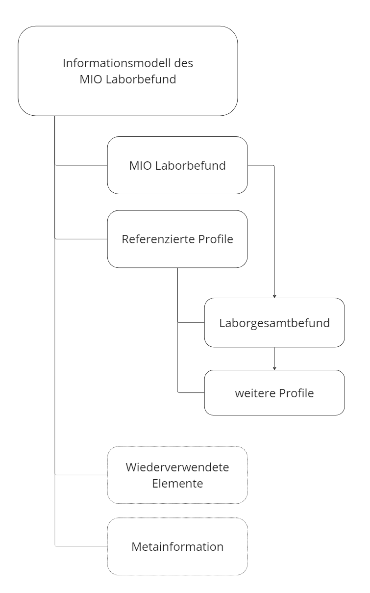 Innerhalb der referenzierten Profile sind einige Verschachtelungen in Form von definierten Referenzierungen enthalten, über die sich der Aufbau des Laborgesamtbefundes erschließt. Diese sind (vereinfacht) in folgender Abbildung 2 dargestellt.