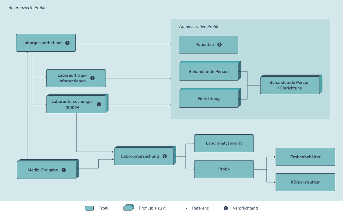 Innerhalb der Referenzierten Profile sind einige Verschachtelungen in Form von definierten Referenzierungen enthalten, über die sich der Aufbau des Laborgesamtbefundes erschließt.