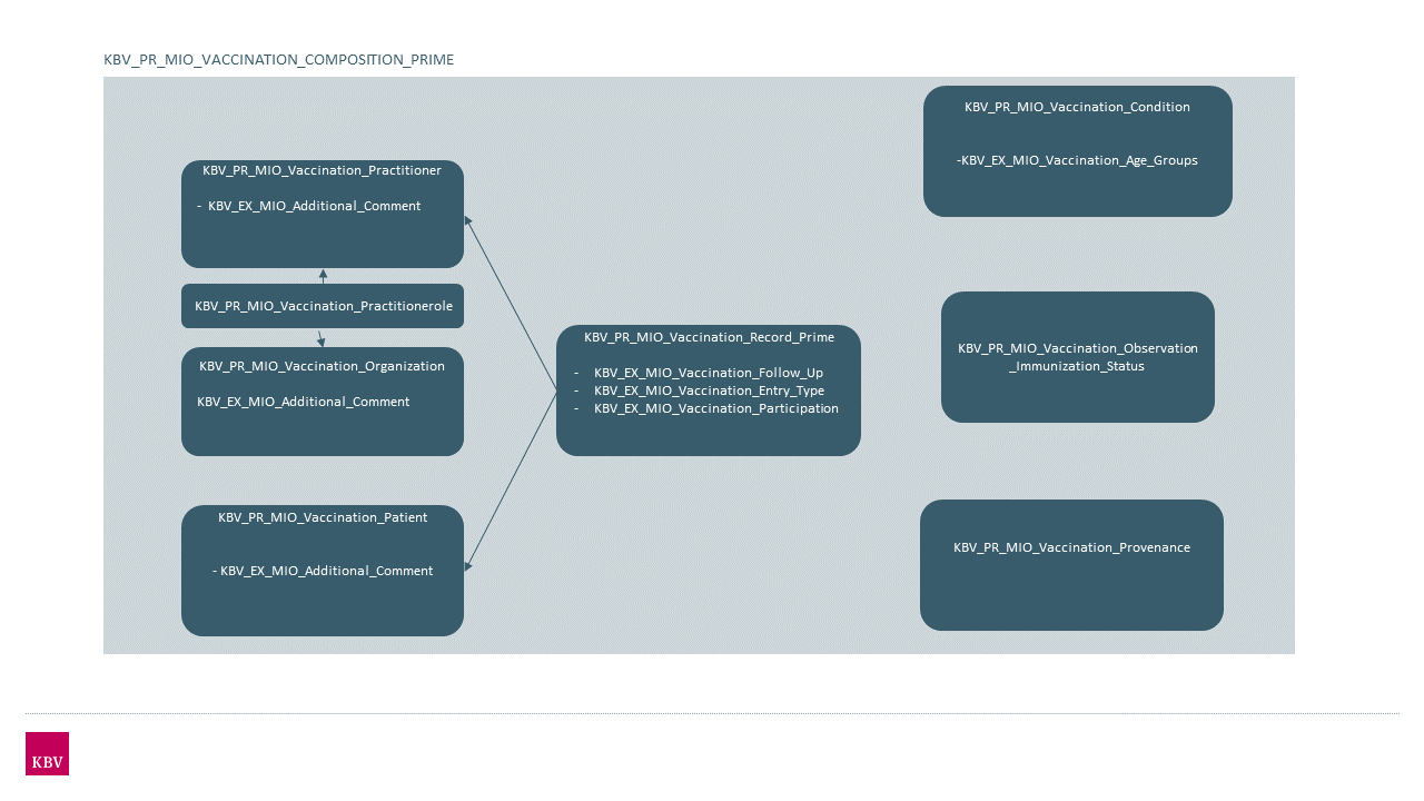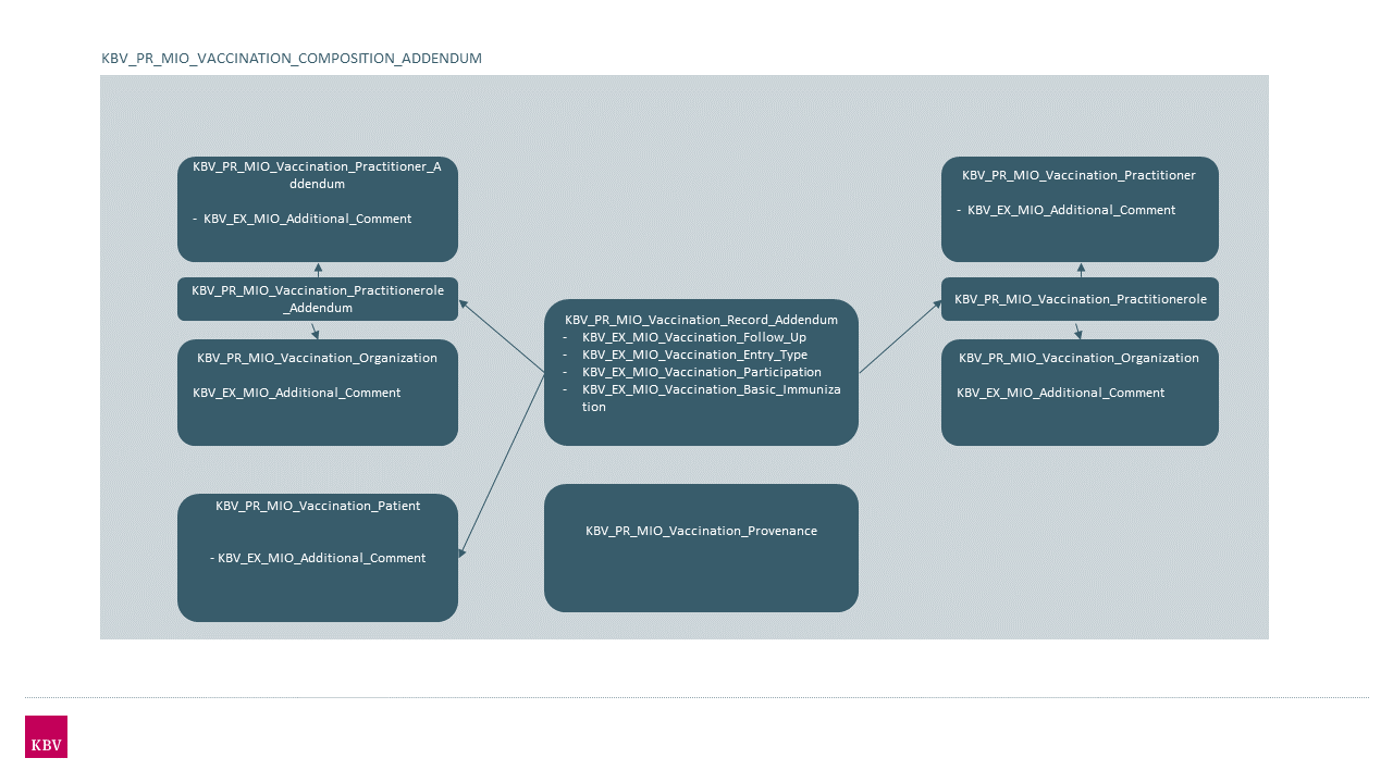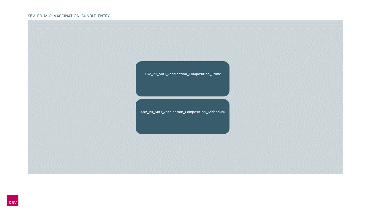 Die Compositions KBV_PR_MIO_Vaccination_Composition_Prime und KBV_PR_MIO_Vaccination_Composition_Addendum geben die Struktur des Dokumentes vor. Die Inhalte bestehen aus Verweisen auf andere Ressourcen. Da ein Dokument im juristischen Sinne vollständig und unveränderlich sein muss, wird die Composition mit allen referenzierten Ressourcen zu einem Bundle zusammengefasst (KBV_PR_MIO_Vaccination_Bundle_Entry).