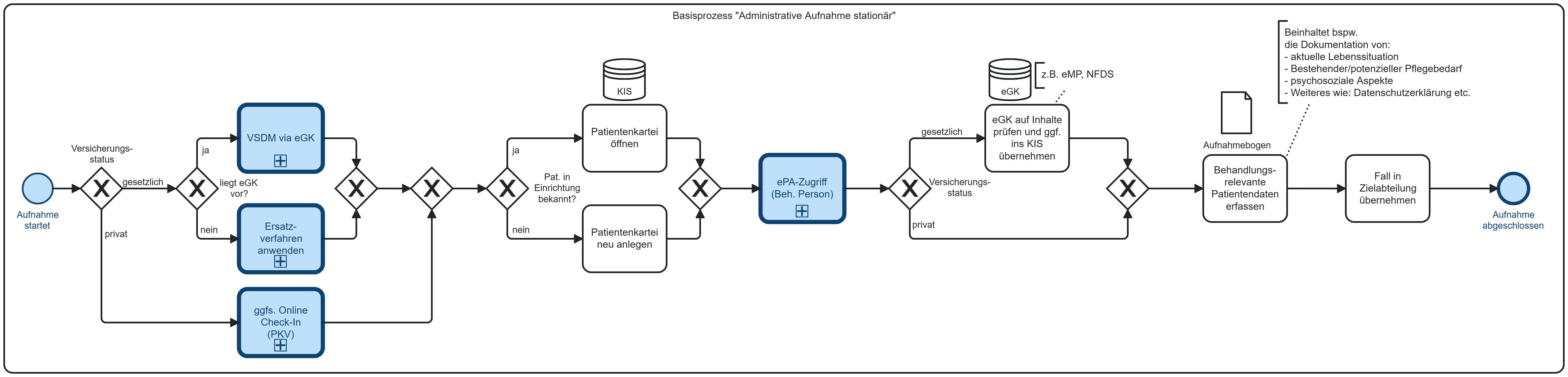 Ein anschließender Schritt ist die Prüfung des Zugriffs auf die elektronische Patientenakte (ePA) des/der Patient:in. Dies dient der Aktualisierung der Daten und der Gewährleistung eines sicheren Datenaustauschs mit anderen behandelnden Personen. Für gesetzlich Versicherte mit eGK erfolgt zudem eine detaillierte Prüfung der Karte auf relevante Inhalte. Hierbei wird insbesondere auf das Vorhandensein eines elektronischen Medikationsplans (eGK-eMP) oder eines Notfalldatensatzes (NFDS) geachtet. Erhalten die ePA und/oder die eGK solche Informationen, werden diese nach Zustimmung des/der Patient:in in das KIS/PS der Klinik übernommen, um sie für die Behandlung bereitzustellen. Dies kann wichtige Hinweise auf bestehende Vorerkrankungen, Allergien oder Medikationen liefern und so die Behandlungsqualität verbessern. Je nach Ablauf der jeweiligen Leistungserbringung – also je nachdem, welche Art von medizinischer Leistung der Patient erhält – werden im Rahmen der administrativen Aufnahme weitere versorgungsrelevante Informationen erhoben. Diese zusätzlichen Informationen sind von großer Bedeutung für die weiterbehandelnden Berufsgruppen, wie beispielsweise Pflegefachkräfte und Ärzt:innen. Dazu gehören beispielsweise Informationen zur aktuellen Lebenssituation, zu pflegerischen Bedürfnissen oder zu psychosozialen Aspekten, die für eine ganzheitliche und patientenorientierte Versorgung relevant sind.
