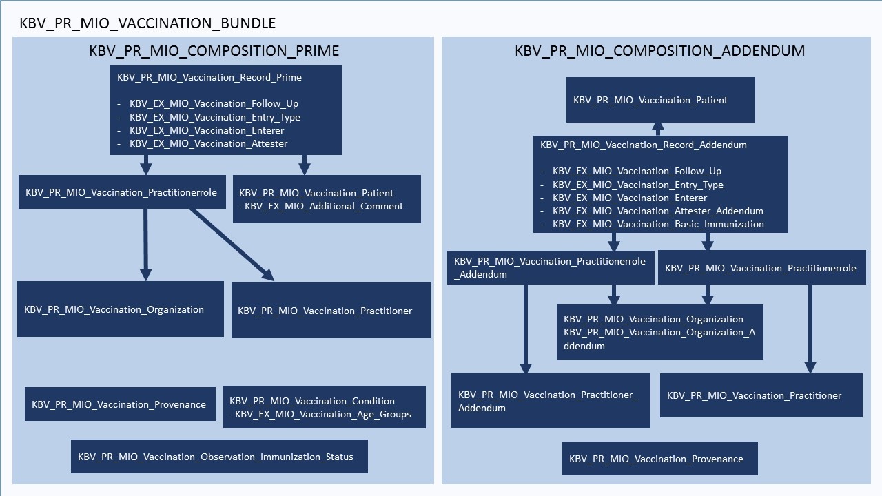 Die Compositions KBV_PR_MIO_Vaccination_Composition_Prime und KBV_PR_MIO_Vaccination_Composition_Addendum geben die Struktur des Dokumentes vor. Die Inhalte bestehen aus Verweisen auf andere Ressourcen. Da ein Dokument im juristischen Sinne vollständig und unveränderlich sein muss, wird die Composition mit allen referenzierten Ressourcen zu einem Bundle zusammengefasst (KBV_PR_MIO_Vaccination_Bundle_Entry).