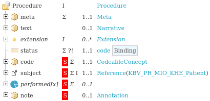 Dieses Profil bildet eine Prozedur ab. Die im FHIR®-Profil abgebildete Information findet sich im Informationsmodell unter 2.3.4.1 Prozedur, 2.5.1 Prozedur, 3.2.2 Prozedur, 3.2.2.1 Code/Bezeichnung, 3.2.2.2 Zeitpunkt, 3.2.2.3 Seitenlokalisation und 3.2.2.4 Hinweise.