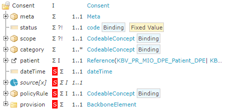 Mit diesem Profil kann die Einwilligung einer versicherten Person abgebildet werden. Die im FHIR®-Profil abgebildete Information findet sich im Informationsmodell unter 1.3.2.3.1 Art der Erklärung, 1.3.2.3 DPE_Versicherte/r_Einwilligung, 1.3.2.3.4 Ablageort, 1.2.2.1.3.1 Art der Erklärung, 1.3.2.3.3 Vorname Arzt/Ärztin, 1.3.2.3.2 Nachname Arzt/Ärztin, 1.2.2.1.3 NFD_Versicherter_Einwilligung, 1.2.2.1.3.2 Arzt/Ärztin Nachname, 1.2.2.1.3.3 Arzt/Ärztin Vorname und 1.2.2.1.3.4 Adresse.