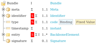 Dieses Profil dient als bündelndes Element. Das Bundle kann als Klammer-Ressource verstanden werden, die die notwendigen Ressourcen zusammenfügt. Diese Ressource und die darin gebündelten Ressourcen können dann mit einer Signatur versehen werden. Das Bundle umfasst in dieser Anwendung die vollständige Patientenkurzakte. Die im FHIR®-Profil abgebildete Information findet sich im Informationsmodell unter 1.1.2 Identifier Type und 1.2.2.2 SignatureArzt.