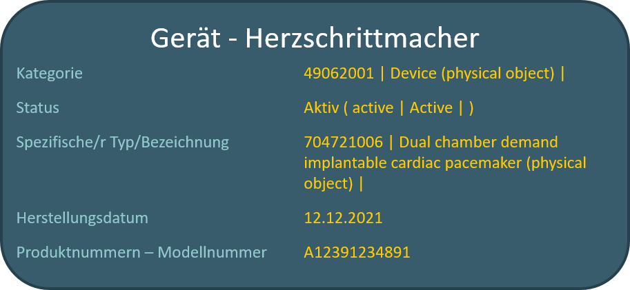 In diesem Element können Informationen zu einem Gerät bzw. Medizinprodukt angegeben werden. Hierbei handelt es sich um ein generisches Profil welches zur Abbildung von unterschiedlichen Gerätearten genutzt werden kann.