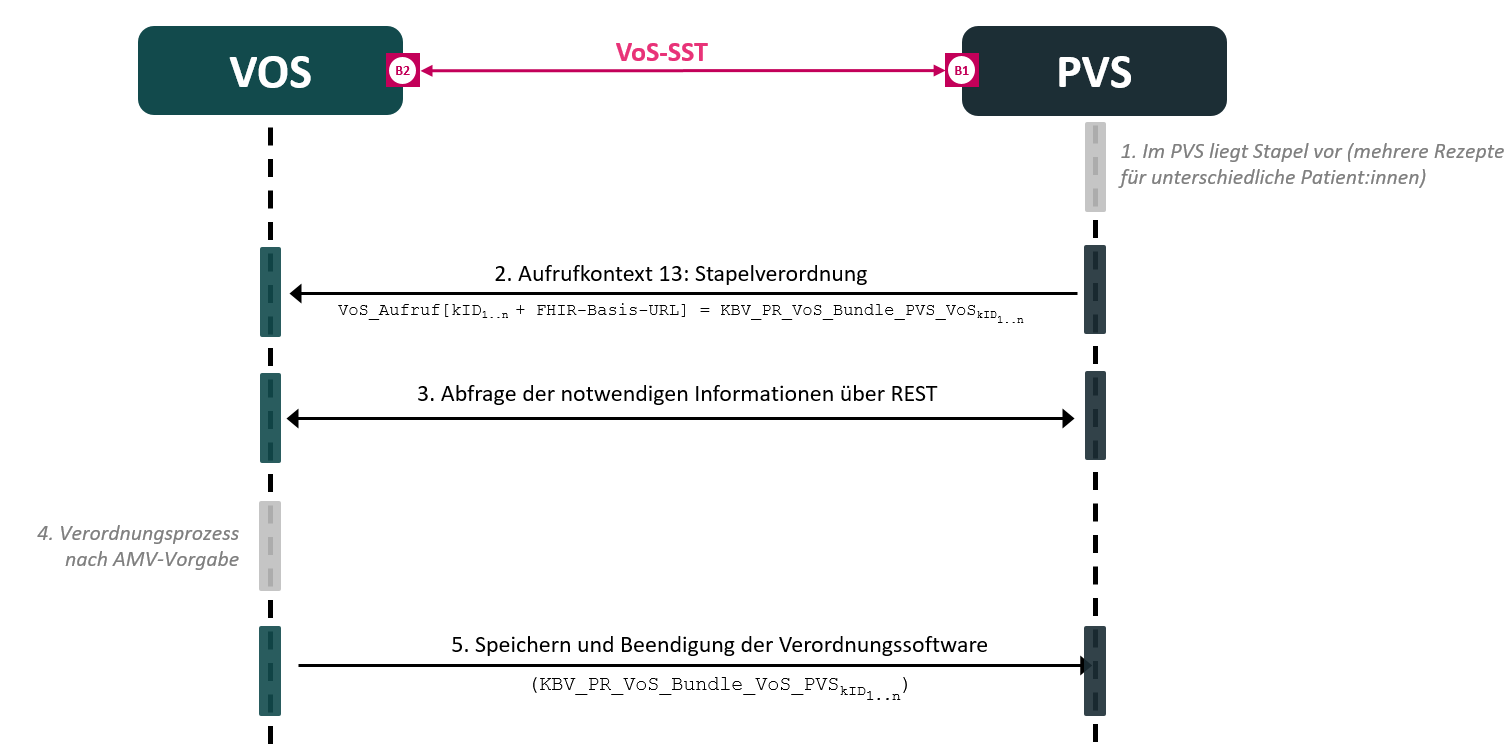 Bei der Stapelverordnung werden im PVS mehrere Rezepte und folglich mehrere Bundles vorbereitet, die dann von der VOS abgerufen werden können. Folglich werden auch die Inhalte dieses Szenarios mehrfach vorkommen.
